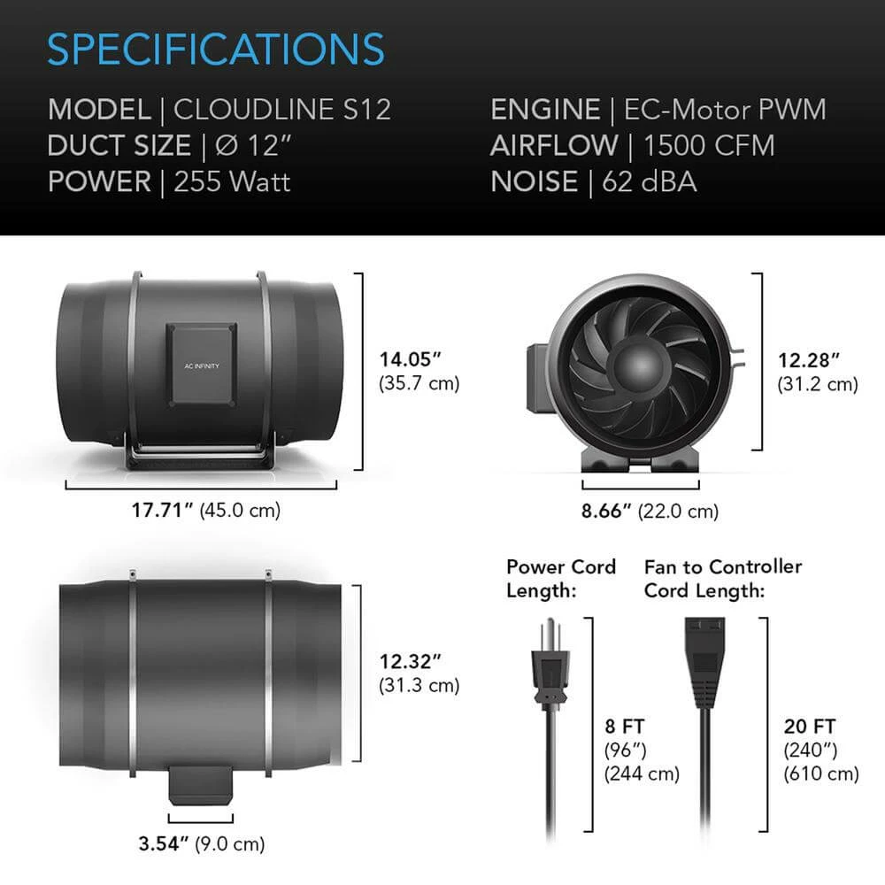 The AC Infinity Cloudline S12, Quiet Inline Duct Fan System With Speed Controller, 12-inch is a smart inline duct fan designed to quietly ventilate hydroponic grow rooms, boost heating/cooling to rooms, circulate fresh air, exhaust projects, and cool AV closets. Features an inline speed controller utilizing PWM-technology. Contains a mixed-flow design and EC-motor for a quiet and high static-pressure performance. The motor box containing the fanโs impeller and blades can be detached from the mounted frame for easy cleaning and maintenance. Complete kit includes one duct fan unit, one corded speed controller, installation manual, all necessary mounting hardware, and a corded AC plug to power the unit through a standard outlet.
