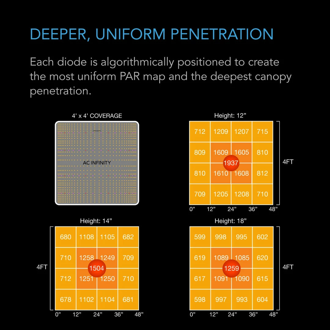 The grow light features a unibody aluminum build, full-spectrum Samsung LM301B LEDs, and algorithmic diode positioning to maximize plant yields. These devices are housed in a premium grow tent, containing the thickest steel frames and 2000D mylar canvas to create a climate-controlled grow space.