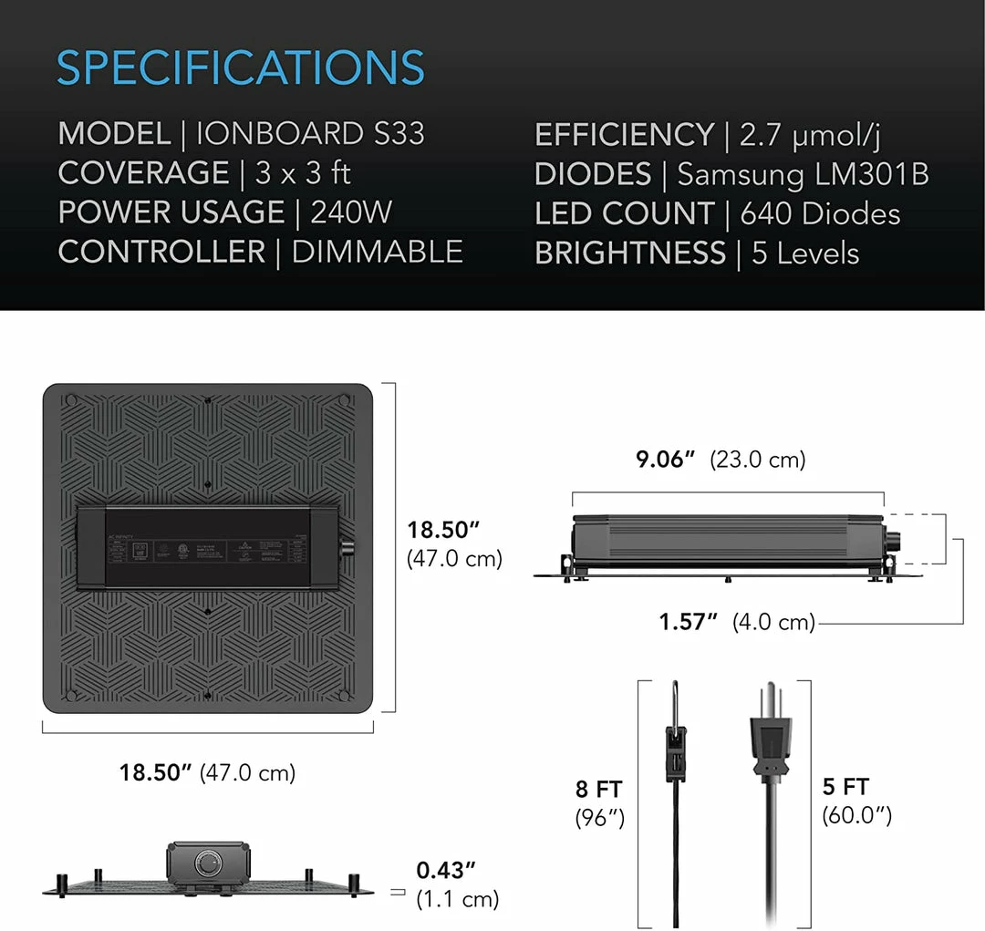 The Ionboard S33 full spectrum LED grow light is designed with algorithmically positioned Samsung LM301B diodes to maximize plant yields. Features a proprietary driver that enables dimming, daisy-chaining, and can connect with our smart controllers. Built on a fanless, unibody aluminum board to dissipate heat and extend the diodesโ lifetime.