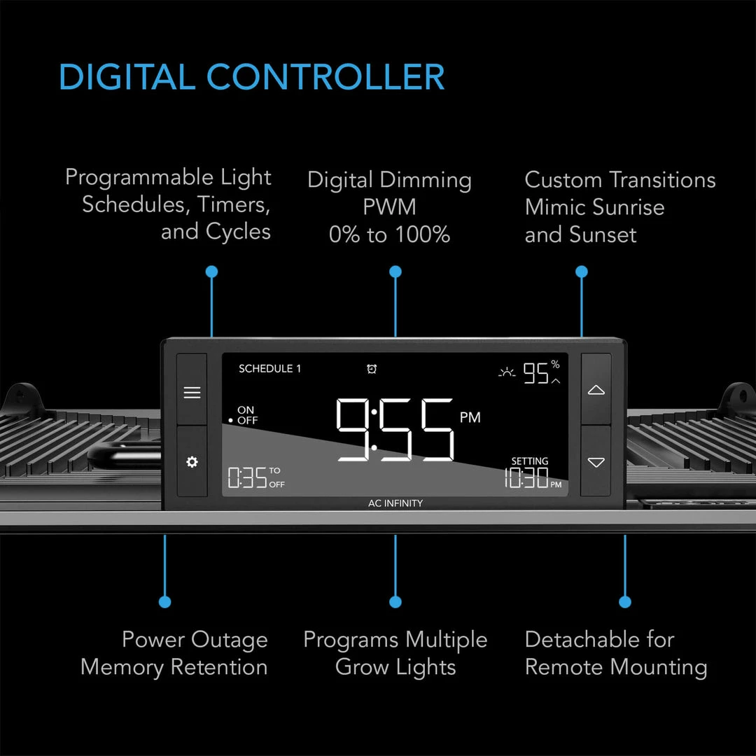 - Digital controller with daisy-chaining ports featuring PWM dimming, timers, cycles, and scheduling.