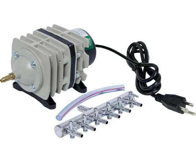 This commercial air pump with 6 outlets is perfect to run several Waterfarms or multiple air stones at once. Electrical magnetic air compressor in a high quality aluminum alloy case, wear and tear resistant material for cylinder and piston. High pressure and high output, comes with multi-outlet divider. Super silent with multi-level muffler, low power consumption. Special artificial rubber to keep a steady air flow output and pressure that can be adjusted freely. 1-Year warranty. 20 Watts, 45 liters per minute, 120V. 700 GPH, maximum amperage is 0.17A and maximum decibels is 45.