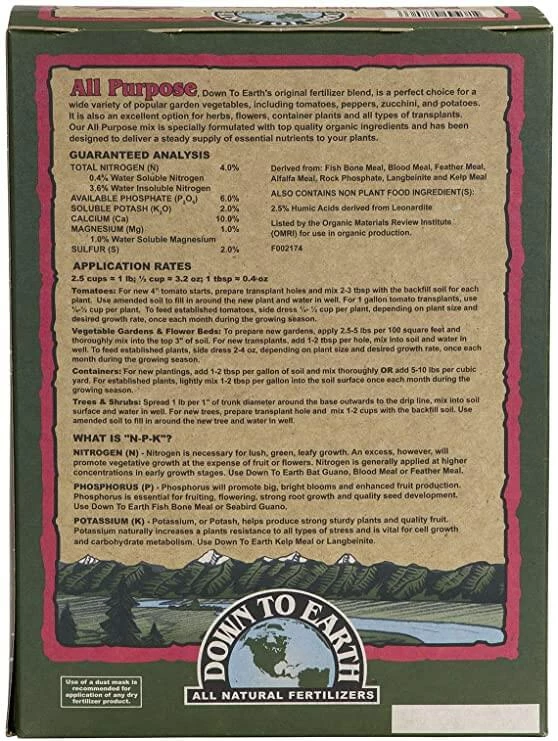 This is a certified organic All-Purpose Fertilizer, with nutrients derived from Fish bone meal, blood meal, feather meal, alfalfa meal, Kelp Meal, and more. It contains balanced essential nutrients, secondary nutrients, and trace minerals.