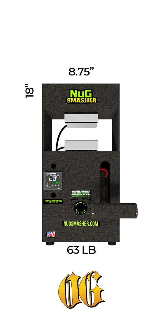 The Original NugSmasher® plug n play Rosin Extraction System featuring 12 Tons of manually controlled pressure and 4 x 4 inch heated extraction plates with and the ability to extract up-to 14g at one time 1000’s in use everyday coupled with a lifetime warranty
