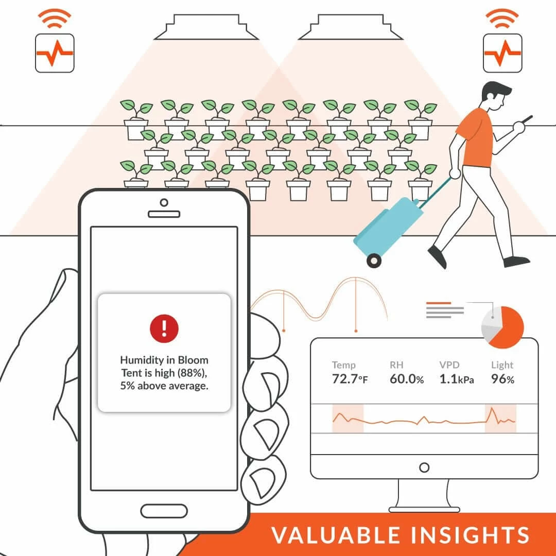 Humidityย – One of the most overlooked aspects of indoor gardening is humidity. Humidity levels can determine if your plants are thriving. However, the wrong humidity can put them at risk of developing mold or pest issues. If your humidity gets too low than you may find your media losing moisture very quickly, which can leave you with plants that dry out sooner than you are available to tend to them. Alternatively if your humidity gets too high you can develop mold issues, especially during flowering stage. Having your entire crop developing mold just before harvest due to a humidity issue can be the most disappointing experience a grower can go through. Pulse puts you in a position to know and react to this!